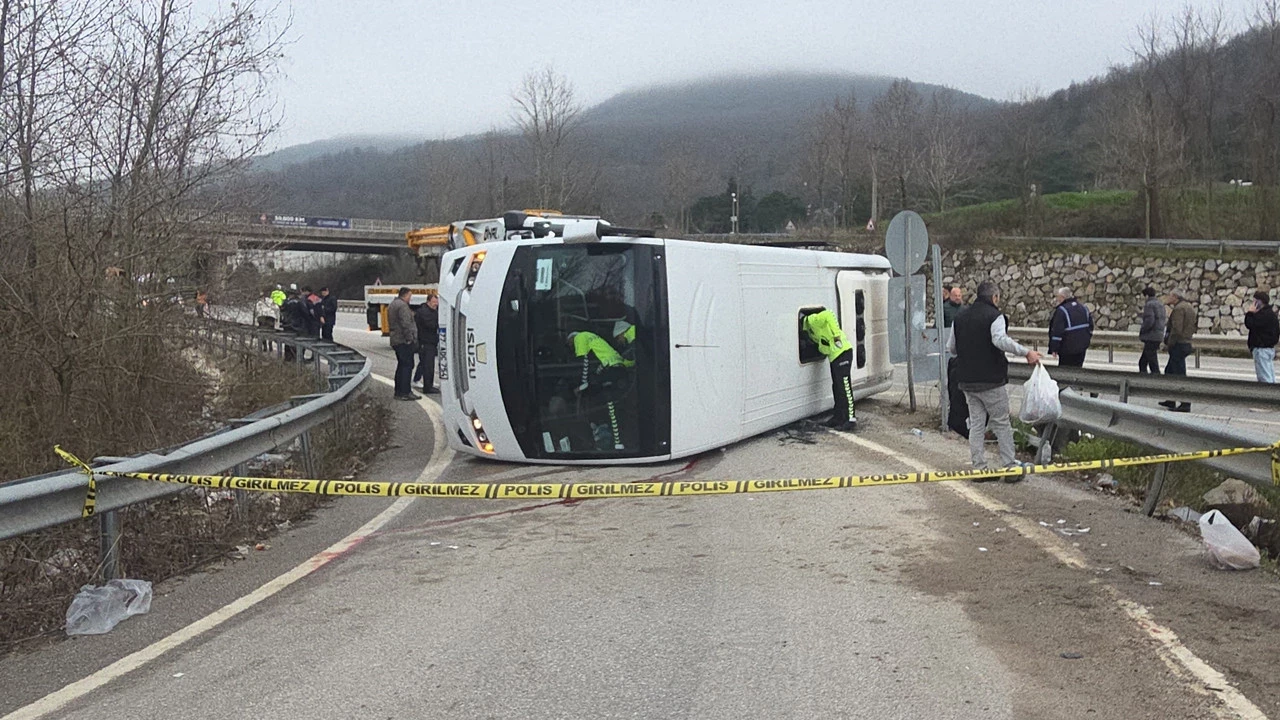 Kaza Bursa-Yalova kara yolu Paşakent mevkisinde meydana geldi. Gemlik’ten Çiftlikköy yönüne tekstil firmasında çalışan işçileri taşıyan 77 ADC 754 plakalı servis midibüsü, sürücüsü Ş.U. (66)’nun direksiyon kontrolünü yitirmesi sonucu devrildi.;
